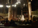 Dann rückt der ganze Chor an, voller Enthusiasmus, alle unterschiedlich schwarz gekleidet, die Frauen mit sehr bunten Schals - das Markenzeichen. Dahinter hell beleuchtet der weiße Jesus mit offenen Armen - überhaupt die ganze Kirche in vorweihnachtlichem Glanz.